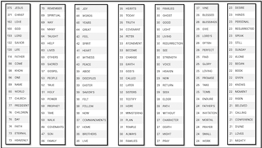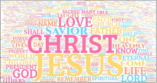 There is a picture on my computer screen that I cannot stop looking at. It is neither portrait nor photograph. It is a word cloud: a square of crowded letters in which large words crouch beside small ones and certain names blaze across the center like lamps at midnight. My friend and colleague Ed Hegeman built it.1 He gathered the full text of every talk given at the April 2026 General Conference, poured all 40,970 words into a generator, and let the program do what programs do. Count. Arithmetic was hired to count and ended by confessing.