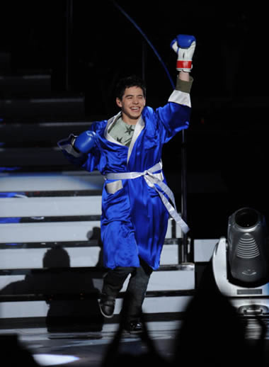 A jubilant David Archuleta enters the “ring” for the night’s competition, with his gloved hand thrusting toward the sky. Click to Enlarge.