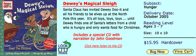 The prestigious Lord and Taylor clothing store chain commissioned Green and Wenger to produce a special Christmas book to benefit Feed the Children. The book, Dewey’s Magical Sleigh, is featured on the front page of the Christmas catalogue and in the store windows. When Hurricane Katrina devastated the South, Feed the Children was on the scene, and Lord and Taylor wanted to add something to benefit the victims of the storm. Actor John Goodman volunteered to record a CD of the book, and so each copy of Dewey’s Magical Sleigh comes with a reading in Goodman’s wonderful style.