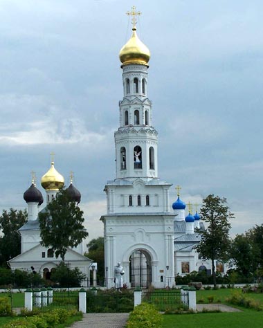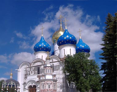 The onion domes of the Cathedral of the Assumption at the Trinity Monastery of St. Sergius. The Russian patriarchy was domiciled here during Soviet times, the traditional Moscow domicile having been destroyed by Joseph Stalin.