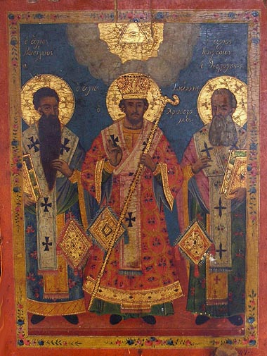 Antique 19th century painted icon depicting the “Three Hierachs of the Church” – Saint Basile the Great, Saint John Chrysostom and Saint Gregory the Theologian.