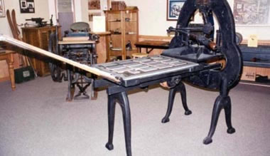 The revolutionary account in the Franklin room is followed by that of the restorative work in the E. B. Grandin Print Shop room and binding rooms. The E.B. Grandin room is home to an old Model 5 Linotype, which casts (or molds) entire lines for printing, replacing the tedious letter-by-letter placement method.