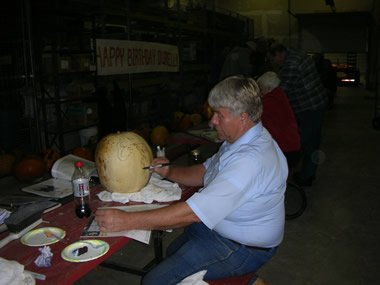 Durell and Kathy Nelson stated that cleaning, scooping, and carving 400 pumpkins went more smoothly this year. After buying the pumpkins, Durell and other artists worked Tuesday and Wednesday drawing designs on them. According to Durell, these drawings are not traced because each pattern must fit each pumpkin. This year Sister Mecham, a site missionary and children’s book illustrator, contributed her artistic talents.