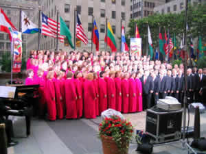Sometimes it is the most trying experiences that turn out to be the most memorable. The Bush Inaugural Parade (where we froze for hours on a float); El Escorial in Spain (where we were squeezed so tightly on narrow steps that there was no room to bring down our music, so we held it up the entire concert); the Musikverein in Vienna (where the temperature continued to climb as we roasted under hot television lights) are all experiences that are still talked about years later. And now we can add singing in drizzling rain at Rockefeller Plaza in New York City.