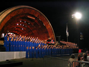 New York traffic took full advantage of its last opportunity to frustrate our plans. We were due at Boston’s Copley Place Marriott by mid-afternoon. But the scheduled free time to find dinner on our own wasn’t to be. We arrived at 6:30 p.m., tore up to our rooms to change, returned to the buses and headed for the Charles River Esplanade, arriving over an hour late for the July 3rd dress rehearsal. Fortunately the crucial camera dry run before a live audience wasn’t until 8:30; and it went well enough that we hope Boston Pops officials weren’t too annoyed with us.