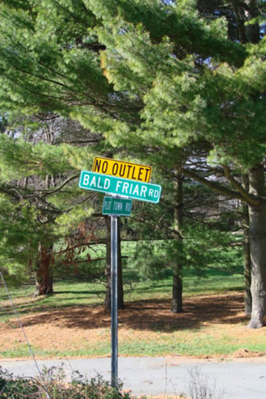 As we came to a fork in the road, Gary pointed out a road that led down to the river. Looking up, I was speechless when we saw a sign that said ” Bald Friar Road .” That was it – the road that led to the ferry landing!