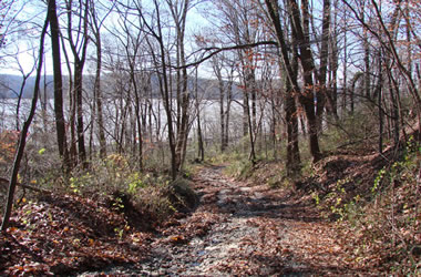 It had rained hard the day before, and rivulets of water swirled around our feet as we carefully picked our way over slippery leaves, logs and rocks. We made it to the bottom where the land flattened into a wide landing at the edge of the river. We saw that railroad tracks had been built parallel to the river; obviously trains had come long after the Cooks/McKissons sold their land in 1805.