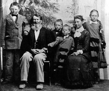 Fielding Langford (1804-1882) and his children by 2nd wife, Carolyn Christina Bocker (from an old tin-type taken about 1880-82). L-R: Joseph, Fielding, Wm. Henry, Anna Caroline, Cynthia Elizabeth, and Malinda Melvina Langford.