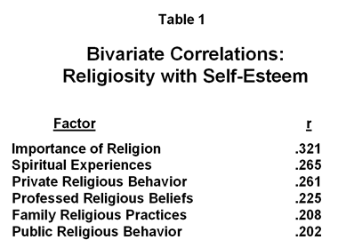 Two separate statistical methods were employed in analyzing the data and determining the relationship, if any, between religiosity and self-esteem. The first statistical test conducted was bivariate correlation analysis. This allowed us to look at the relationship of one factor, such as religious beliefs, to another single factor, such as self-esteem. Bivariate correlations show us the strength of a variable in predicting a certain outcome (which in this study was self-esteem) independent of the influence of all the other factors.