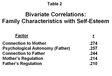 As will be seen in Figures 2 and 3, certain of the family characteristics-the three parenting practices of connection, regulation, and psychological autonomy-were statistically significant factors in predicting self-esteem among LDS teens. The focus of this article, however, is on the relationship between religion and self-esteem. The family connection will be addressed in subsequent publications.