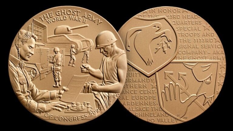 A new Congressional Gold Medal featuring the designs of BYU illustration professor Justin Kunz was recently unveiled at a ceremony held at the U.S. Capitol in Washington, D.C. Kunz’s work adorns both sides of a new Congressional Gold Medal that was presented to living members of the 23rd Headquarters Special Troops and the 3133 Signal Service Company, known collectively as the “Ghost Army” for their remarkable contributions during World War II. The Ghost Army, comprised of approximately 1,000 men, used innovative tactics like inflatable tanks, sound effects and radio trickery to mislead German troops on European battlefields during World War II. Their efforts preserved thousands of American lives and helped win the war. Details regarding the Ghost Army and its tactics were classified for fifty years following the war but are now coming to light after Congress authorized the medal on February 1, 2022. “It was a great honor to use my artwork to honor these people who haven’t had proper recognition, because their mission was secret, and it continued to be secret after World War II for decades,” said Kunz. “It’s wonderful to be able to be part of remembering them and giving the kind of honor that they deserve … Continue reading BYU professor’s designs featured on new Congressional Gold Medal