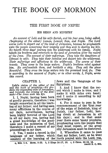 Elder Orson Pratt divided the chapters into smaller chapters and added verses for easier reference. He patterned the changes after the King James Bible. His numbering system became the standard for all future Latter-day Saint editions. Note the first footnotes and indented verse numbers. Changes made the text more readable.