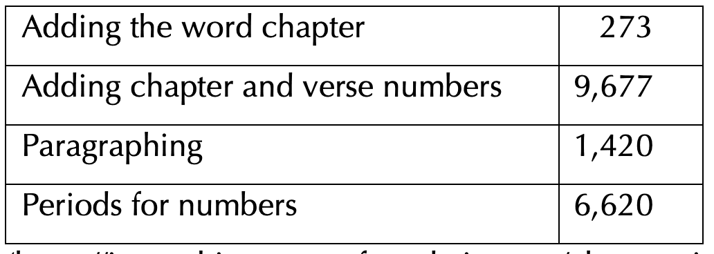 The first edition Book of Mormon was not divided into verses but into very long chapters. First Nephi chapter one is sixteen pages long. What was one chapter then is now five. Every time the word chapter was added, it is counted as a change to the original text.