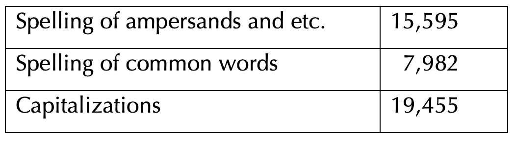 - spelling out “and” in place of an ampersand (&) made 15,577 changes (https://journal.interpreterfoundation.org/changes-in-the-book-of-mormon/#:~:text=). (The Book of Mormon: The Earliest Text, Royal Skousen, introductory pages.)