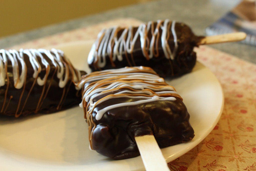 I remembered seeing a picture on a calendar of square brownie pops on a stick. They had cut brownies into rectangles and then dipped them in frosting. That seemed like a good idea. We cut the blondies into squares, stuck popsicle sticks in each, and stuck them in the freezer.