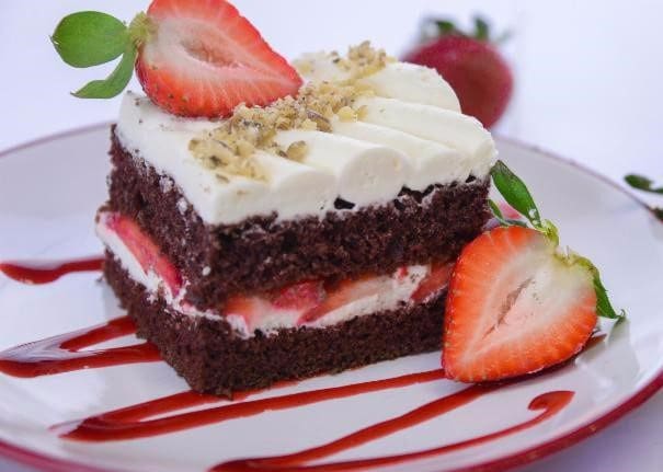 This is a Fudgy Baby Cake with a layer of whipped cream frosting and thinly sliced strawberries between the layers. The frosting on top was applied with a pastry bag and a round tip. This is a luscious cake made