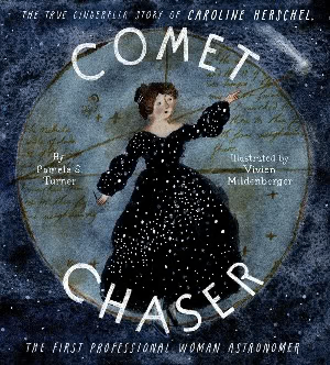 Comet Chaser: The True Cinderella Story of Caroline Herschel, the First Professional Woman Astronomer, by Pamela S. Turner and beautifully rendered in paint by Vivien Mildenberger, is about a highly intelligent young woman, born in 1750, who almost became a family servant but rose above it all to become a distinguished astronomer. Along with her brother, she built telescopes that still stand today. Through her investigations of science, what she discovered in the sky at the time was astounding! Be sure to check out the wonderful end-pages and more information found at the back.