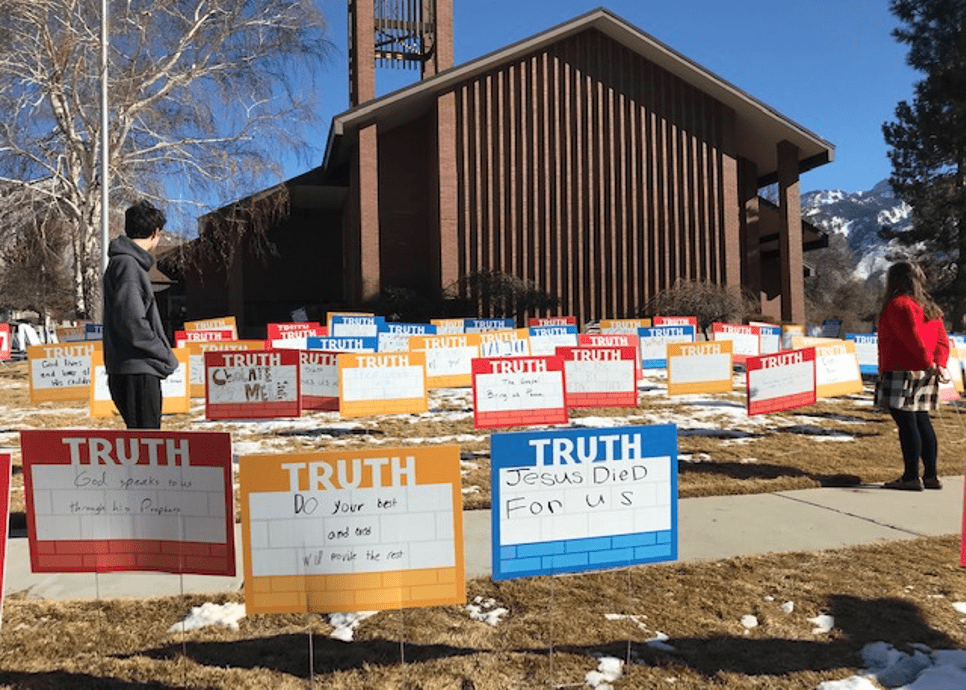 Two hundred and twenty Young Women and Young Men in our stake each wrote a statement of truth on a red, yellow, or blue TRUTH placard that was placed on the lawn of the most trafficked ward building in our stake. Many passersby on foot, bike, and car stopped to walk around and read the signs. Some took photos. There were a few duplicate signs such as “I am a child of God” and “Love One Another” but not as many as you would think.