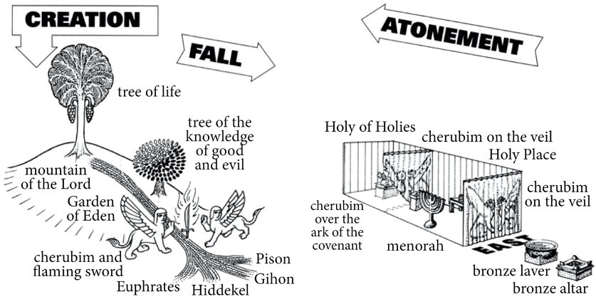 Adapted from Michael P. Lyon (1952–2022): Sacred Topography of Eden and the Temple, 1994.[6] The outbound journey of the Creation and the Fall at left is mirrored in the inbound journey of the temple at right. Each major feature of Eden (that is, the river, the cherubim, the tree of knowledge,[7] the tree of life) corresponds to a symbol in the Israelite temple (that is, the bronze laver, the cherubim, the veil, the menorah). Likewise, the high priest is “cultic Adam.”[8]