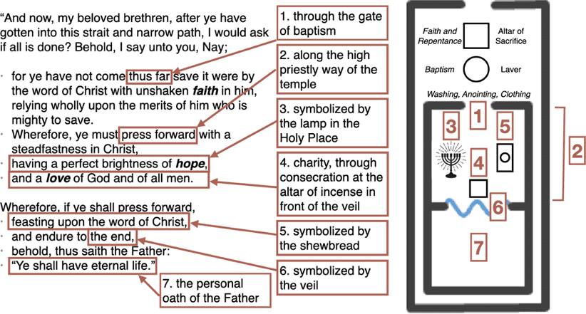 Now let’s return to Nephi’s teachings. For brevity’s sake, we’ll focus only on two verses from the longer passage: 2 Nephi 31:19–20. In prior verses, Nephi has already exhorted his readers to “follow the Son, with full purpose of heart”[61] and to enter the gate of “repentance and baptism by water.”[62] The altar of sacrifice and the laver that sit in the courtyard, outside the temple door, evoke these two themes. Nephi teaches that baptism, in turn, prepares his readers to receive “a remission of … sins by fire and by the Holy Ghost.”[63] Then, Nephi weaves the single mention of faith, hope, and love within these chapters into a masterful description of the culminating sequence of the pathway to eternal life that leads through the ancient temple (please refer to the numbered annotations in the figure above):