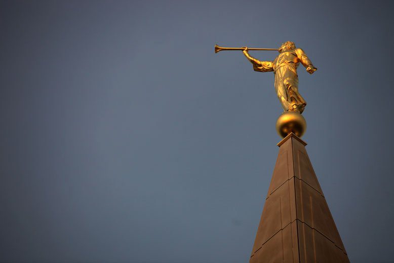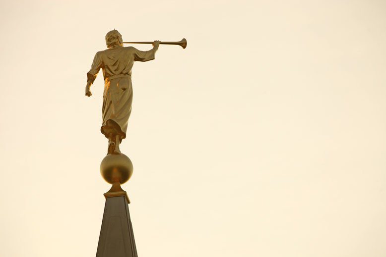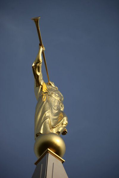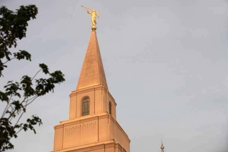 Most Latter-day Saint temples face east toward the rising sun, and the Kansas City Missouri Temple is no exception. On the top of that east tower is Moroni, a reminder of the angel bringing the everlasting gospel in the last days. The height to the top of the east tower is 139 with a 12′ gilded angel Moroni statue, bringing the total to height to 151′. -