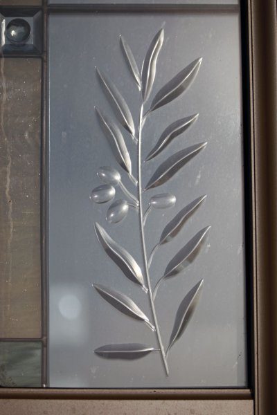 The olive branch etched into the window pane shines in the light as all peace offerings always do. -