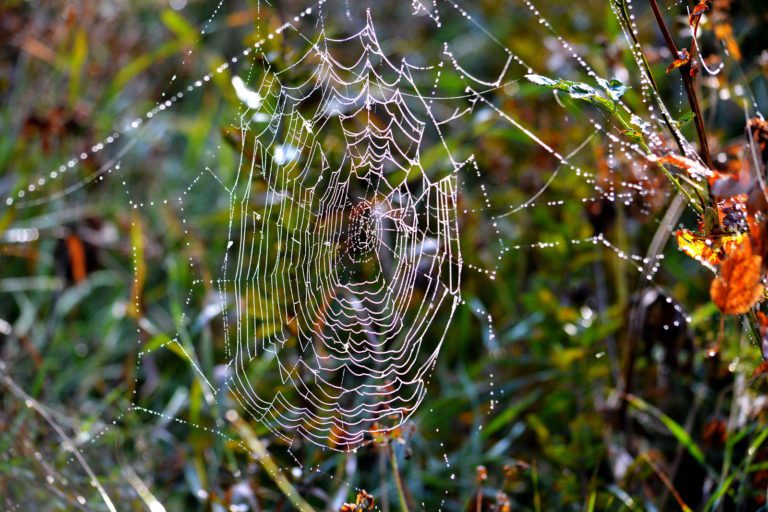 As I meandered through a patch of weeds I was startled by the hordes of grasshoppers hurtling from place to place. They thumped into my legs and chest as they catapulted by. Grasshoppers are great at distance but not worth a darn at direction. I happened to be watching a particular insect in his flight when he stopped in mid-air. I blinked and looked again and saw him (gender is a guess here: it might have been a her) begin to vibrate madly. It was then that I saw the restraining strands of spider silk, stretched between two clumps of brush. I bent down and my eyes widened as I saw the size of the spider furiously shaking the web to prevent the escape of dinner. The bloated body was circular, about the circumference of a quarter. The legs stretched out two inches on the sides. I love nature photography, and usually carry the necessary equipment. “Lydia,” I called. “Come here, and bring my camera with the macro lens!”