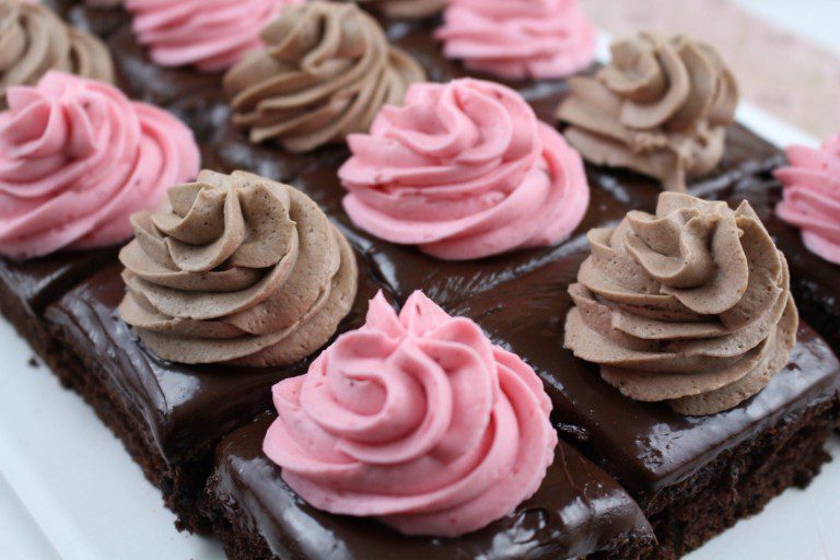 That’s the pink and chocolate frosted cake above. The cake is a cream cake baked in a 9×13-inch pan, cut into 15 pieces, and then topped with two kinds of whipped cream frosting.