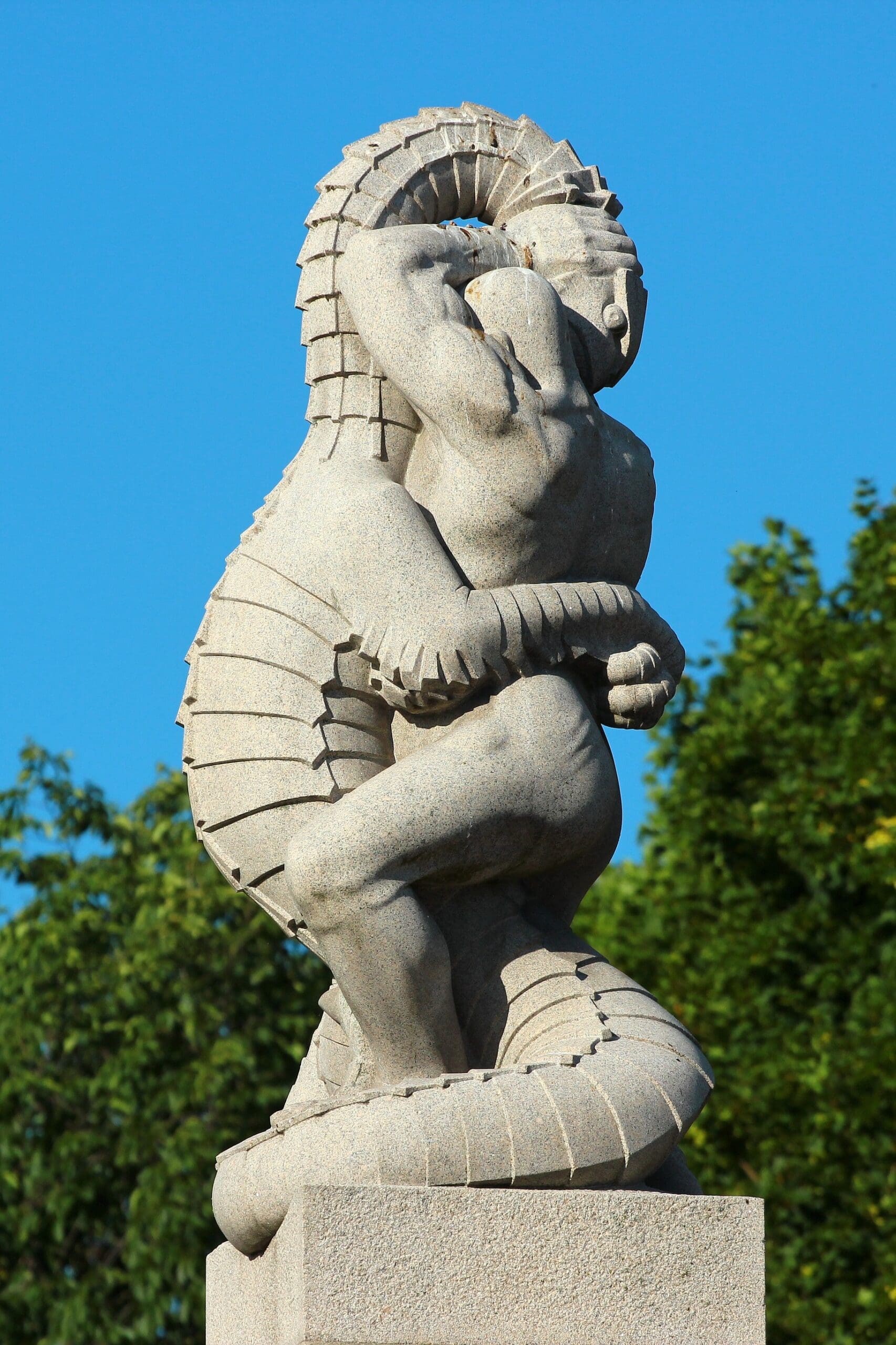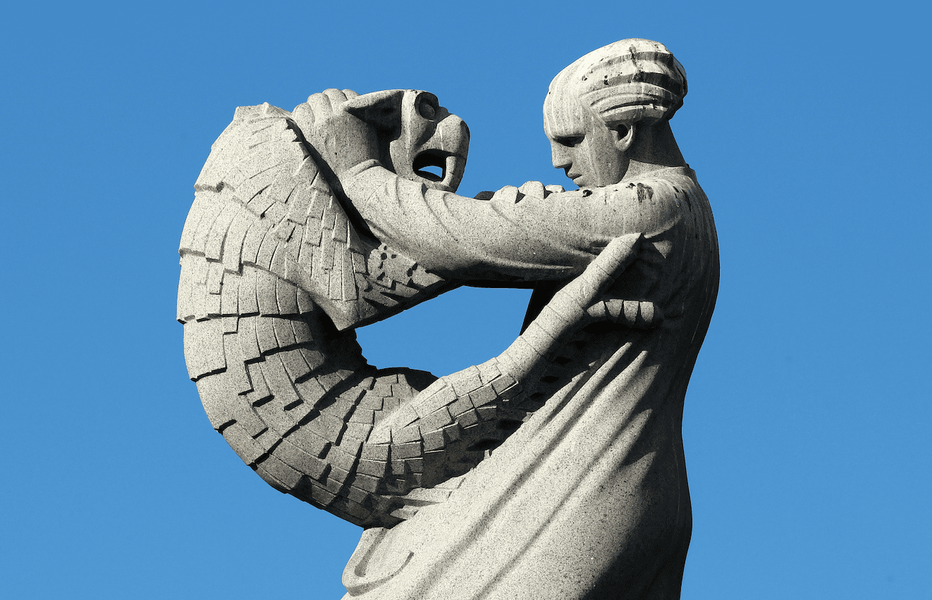 The focal point of the collection is Vigeland’s most imposing work. Known as the Monolith, its 46-foot-high column is carved from a single block of granite displaying 121 human figures entwined in a powerful spiral representing the human lifecycle. However, while impressive, my own emotions were captured by a display of lesser but still striking works, four statues set atop tall pillars—forming the corners of a self-determined square—depicting humans locked in desperate combat with monstrous figures.