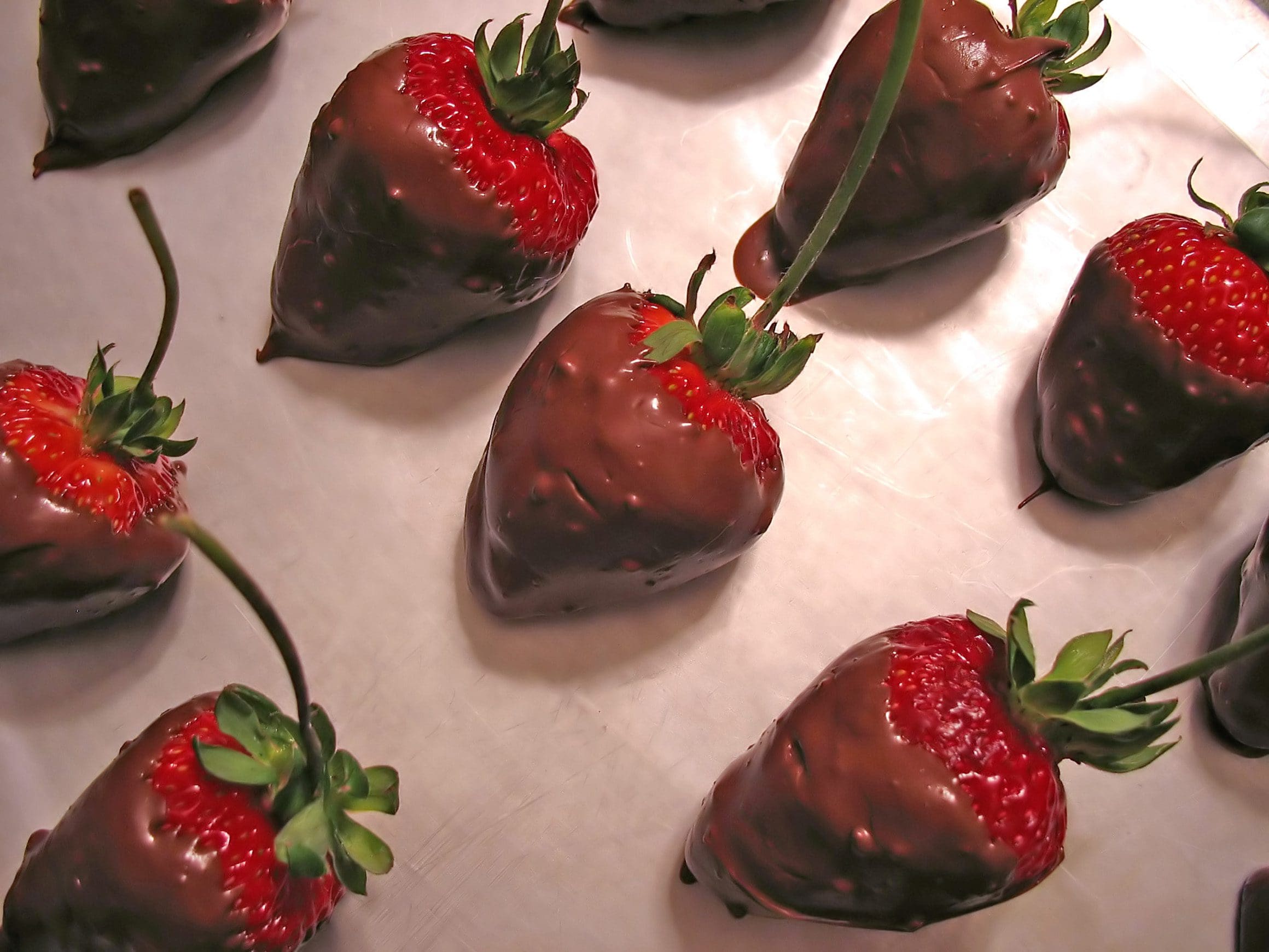 Chocolate covered strawberries are absolutely luscious and simple. Take really good strawberries and dip them in really good melted chocolate.