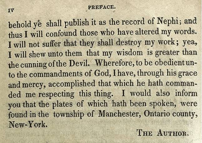 The Preface to the Book of Mormon is not in our current Book of Mormon. It seems Joseph wrote it to clarify certain facts for the people of his time, specifically about the loss of the 116 pages. He began: “TO THE READER—As many false reports have been circulated respecting the following work, and also many unlawful measures taken by evil designing persons to destroy me, and also the work….” He then explained the loss of the 116 pages: “Some person or persons have stolen and kept from me, notwithstanding my utmost exertions to recover it again.” Next, he said that God told him not to retranslate the 116 pages because Satan had put it into their hearts to alter the words. “And if I should bring forth the same words again, or, in other words, if I should translate the same over again, they would publish that which they had stolen.” Joseph then quoted the Lord, “I will not suffer that they shall destroy my work; yea, I will shew unto them that my wisdom is greater than the cunning of the Devil.” Joseph added one more fact: “I would also inform you that the plates of which hath been spoken, were found in the township of Manchester, Ontario county, New-York.”