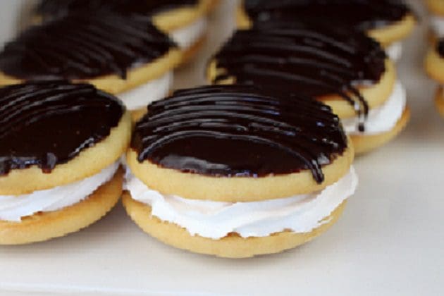 Whoopie pies have been around for a long time—two cake-like cookies filled with whipped cream, pastry filling or frosting. The ones above have a thick, fudge-like frosting. To give it more substance, we used a vanilla bean cream cake mix that has pudding in the mix. You can get the mix for free with the coupon code above.